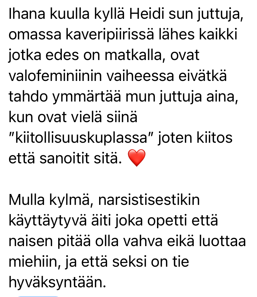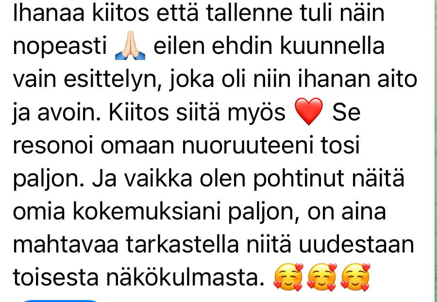 "Olen viime kuukausina joutunut katsomaan suoraan omiin varjoihini, tämä kurssi tuli täydelliseen saumaan. Oli aivan ihanaa, miten paljon Heidi jakoi omia kokemuksiaan – entisenä miesten miellyttäjänä oli niin helppo samaistua siihen kaikkeen. Se loi heti turvallisen ja avoimen ilmapiirin, jossa pystyi olemaan rehellinen myös itselleen.
