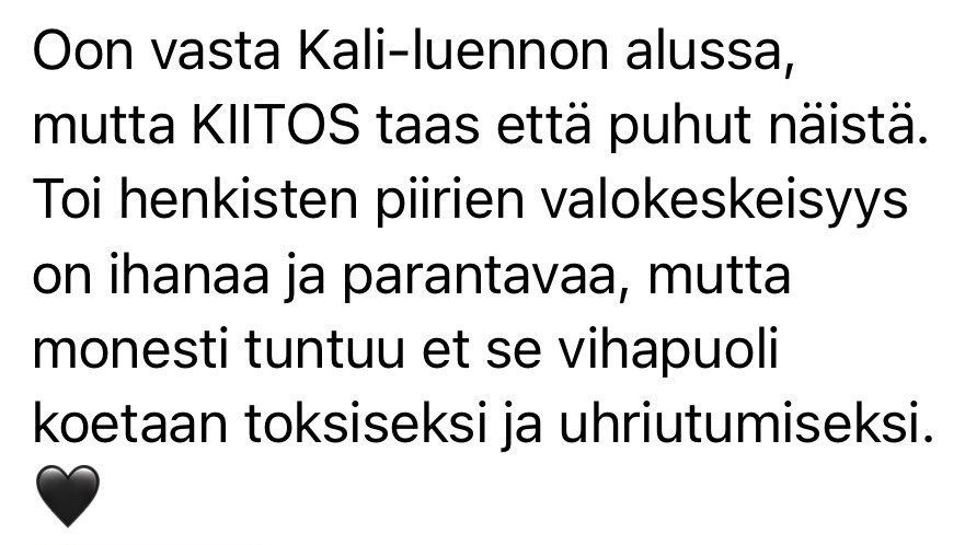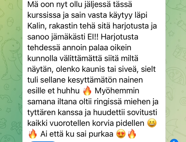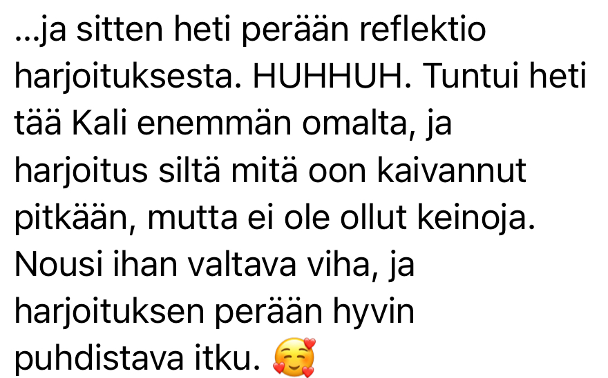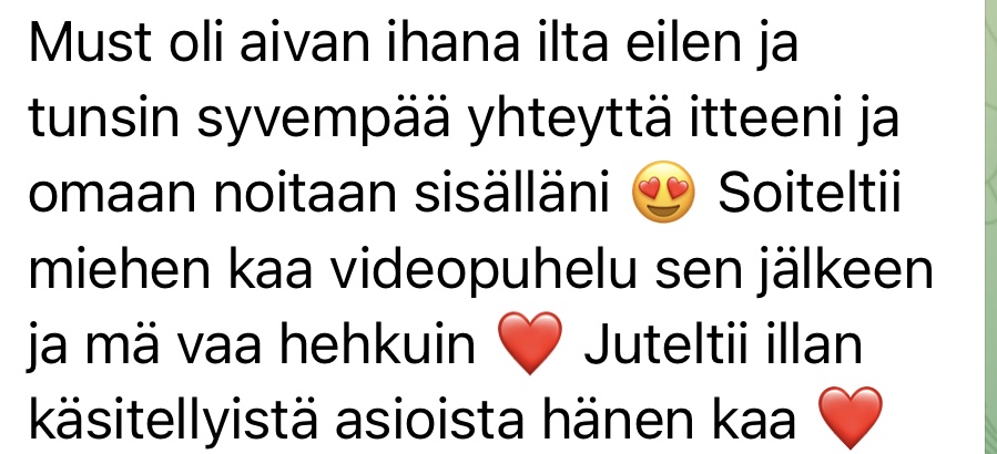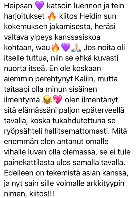"Hei kiitos ihan hurjasti tästä Pimeä feminiini kurssista Villinainen yoni-kivi-harjoitus kruunasi kyllä koko kurssin, ihan huikea. Tykkään sun tavasta kertoa näistä asioista ja ohjata harjoituksia. Elät todeksi sitä, mitä opetat, ja se on arvokkaampaa kuin mikään muu. Kaikki pimeän feminiinin arkkityypit kiehtoo mua ja näyttää mulle jotain itsestäni. Tällä hetkellä koen Kalin tärkeimmäksi, sillä tarvitsen terveen yhteyden rajat osoittavaan ja uudistavaan vihaan" - Nainen